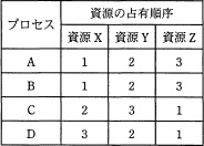 応用情報技術者 平成23年度秋期午前問20 << 前の問題 | 次の問題 >>午前問20三つの資源X〜Zを占有して処理を行う四つのプロセスA〜Dがある。各プロセスは処理の進行に伴い、表中の数値の順に資源を占有し、実行終了時に三つの資源を一括して解放する。プロセスAとデッドロックを起こす可能性のあるプロセスはどれか。アB、C、DイC、DウCだけエDだけ『情報処理過去問.com』からiPhoneアプリがリリースされました!!正解イ<< 前の問題 | 次の問題 >>