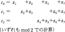 符号長7ビット、情報ビット数4ビットのハミング符号による誤り訂正の方法を、次のとおりとする。 受信した7ビットの符号語x1x2x3x4x5x6x7(xk=0又は1)に対してを計算し、c0、c1、c2の中に少なくとも一つは0でないものがある場合には、 i = c0+c1×2+c2×4を求めて、左から i ビット目を反転することによって誤りを訂正する。 受信した符号語が1000101であった場合、誤り訂正後の符号語はどれか。