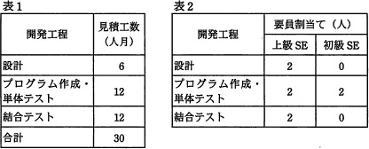 あるプログラムの設計から結合テストまでの開発工程ごとの見積工数を表1に示す。また、この間の開発工程ごとの上級SEと初級SEの要員割当てを表2に示す。上級SEは、初級SEに比べて、プログラム作成・単体テストについて2倍の能力を有する。表1の見積工数は、上級SEの能力を基にしている。 すベての開発工程で、上級SEを1人追加して割り当てると、この間の開発工程の期間を何か月短縮できるか。ここで、開発工程は重複させないものとし、要員全員が1カ月当たり1人月の工数を投入するものとする。
