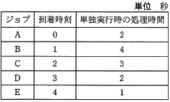 応用情報技術者 平成25年度春期午前問17 << 前の問題 | 次の問題 >>午前問17五つのジョブA〜Eに対して、ジョブの多重度が1で、処理時間順方式のスケジューリングを適用した場合、ジョブBのターンアラウンドタイムは何秒か。ここで、OSのオーバヘッドは考慮しないものとする。ア8イ9ウ10エ11『情報処理過去問.com』からiPhoneアプリがリリースされました!!正解エ<< 前の問題 | 次の問題 >>
