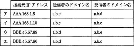 よって、接続元IPアドレス、電子メールの送信者のメールアドレスのドメイン名、電子メールの受信者のメールアドレスのドメイン名が全て社外・他社の「ウ」が第三者中継と判断できるログとなります。