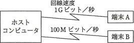 図のようなネットワーク構成のシステムにおいて、同じメッセージ長のデータをホストコンピュータとの間で送受信した場合のターンアラウンドタイムは、端末Aでは100ミリ秒、端末Bでは820ミリ秒であった。上リ、下りのメッセージ長は同じ長さで、ホストコンピュータでの処理時間は端末A、端末Bのどちらから利用しても同じとするとき、端末Aからホストコンピュータへの片道の伝送時間は何ミリ秒か。ここで、ターンアラウンドタイムは、端末がデータを回線に送信し始めてから応答データを受信し終わるまでの時間とし、伝送時間は回線速度だけに依存するものとする。