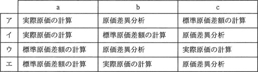 応用情報技術者 平成31年度春期午前問77 << 前の問題 | 次の問題 >>午前問77図に示す標準原価計算の手続について、a〜cに該当する適切な組合せはどれか。アイウエ『情報処理過去問.com』からiPhoneアプリがリリースされました!!正解イ<< 前の問題 | 次の問題 >>