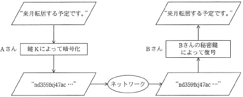 公開鍵暗号方式を用いて、図のようにAさんからBさんへ、他人に秘密にしておきたい文章を送るとき、暗号化に用いる鍵Kとして、適切なものはどれか。