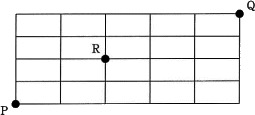 図の線上を、点Pから点Rを通って、点Qに至る最短経路は何通りあるか。