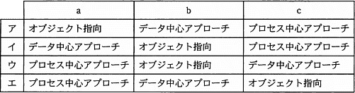 ITパスポート 平成22年度秋期午前問45 << 前の問題 | 次の問題 >>午前問45ソフトウェア開発で利用する手法に関する記述 a〜cと名称の適切な組合せはどれか。業務の処理手順に着目して、システム分析を実施する。対象とする業務をデータの関連に基づいてモデル化し、分析する。データとデータに関する処理を一つのまとまりとして管理し、そのまとまりを組み合わせて開発する。アイウエ『情報処理過去問.com』からiPhoneアプリがリリースされました!!正解エ<< 前の問題 | 次の問題 >>
