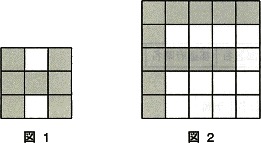 図を画素で表す手法を考える。図1の場合、3×3個の画素を左上から1行ずつ右方向へ1画素ずつ読み取り、黒ならB、白ならWと書くと"BWBBBBBWB"(9文字)となる。次に、BやWが n個連続する場合を"Bn"、"Wn" と表す(nは2以上の整数)と、図1は"BWB5WB"(6文字)と表現でき、この時の圧縮率を6/9=66.7%であると仮定する。図2の5×5の図形について同じ手法で表現すると圧縮率は何%か。