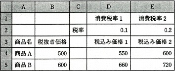 ITパスポート 平成22年度春期午前問55 << 前の問題 | 次の問題 >>午前問55セルD2とE2に設定した 2種類の仮の消費税でセルA4とA5の商品の税込み価格を計算するために、セルD4に入れるべき計算式はどれか。ここで、セルD4に入力する計算式は、セルD5、E4及びE5に複写して使うものとする。アB4*(1.0+D2)イB$4*(1.0+D$2)ウ$B4*(1.0+D$2)エ$B$4*(1.0+$D2)『情報処理過去問.com』からiPhoneアプリがリリースされました!!正解ウ<< 前の問題 | 次の問題 >>