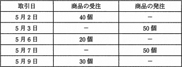 ITパスポート 平成23年度春期午前問10 << 前の問題 | 次の問題 >>午前問10ある販売会社が扱っている商品の4月末の実在庫数が100個であり、5月10日までの受発注取引は表のとおりである。商品は発注目の5日後に入荷するものとし、販売会社と商品発注先の休日、及び前月以前の受発注取引を考えない場合、5月10日時点の引当可能在庫数は何個か。ここで、引当可能在庫数とは、その時点の在庫のうち引当可能な数量とする。ア60イ90ウ110エ140『情報処理過去問.com』からiPhoneアプリがリリースされました!!正解ア<< 前の問題 | 次の問題 >>