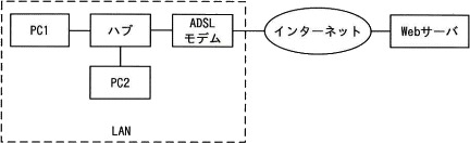 | PC1 からLAN内の PC2 やADSLモデムにアクセスできる状態である。 | |