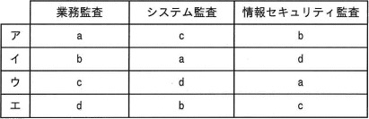 監査を、業務監査、システム監査、情報セキュリティ監査に分類したとき、監査の目的に関する記述a〜dと監査の種類の適切な組合せはどれか。財務諸表がその組織体の財産、損益の状況などを適正に表示しているかを評価する。情報セキュリティ確保の観点も含めて、情報システムに関わるリスクに対するコントロールが、リスクアセスメントに基づいて適切に整備・運用されているかを評価する。情報セキュリティに関わるリスクのマネジメントが効果的に実施されるように、リスクアセスメントに基づく適切なコントロールの整備、運用状況を評価する。組織の製造、販売などの会計業務以外の業務全般についてその遂行状況を評価する。