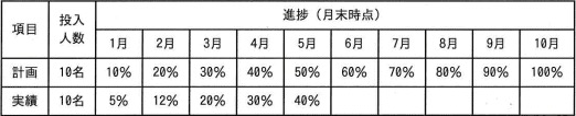 10か月で完成予定のソフトウェア開発プロジェクトにおいて、投入人数及び月末時点での進捗は表のとおりである。プロジェクトの立ち上がりで効率が悪かったことから、5月末時点の進捗が計画の50%に対して40%であった。4月以降の生産性が維持できるとすると、開発期限厳守のためには6月以降に必要な追加人員は最低何人か。ここで、追加人員の生産性は、既に投入済みの人員の4月以降の生産性と同じとする。