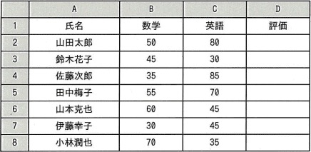 ITパスポート 平成28年度秋期午前問82 << 前の問題 | 次の問題 >>午前問82セル B2〜C8 に学生の成績が科目ごとに入力されている。セル D2 に計算式 "IF(B2≧50、'合格'、IF(C2≧50、'合格'、'不合格'))" を入力し、それをセル D3〜D8 に複写した。セル D2〜D8 において"合格"と表示されたセルの数は幾つか。ア2イ3ウ4エ5『情報処理過去問.com』からiPhoneアプリがリリースされました!!正解エ<< 前の問題 | 次の問題 >>