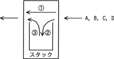 後に入れたデータが先に取り出されるデータ構造(以下、スタックという)がある。これを用いて、図に示すような、右側から入力されたデータの順番を変化させて、左側に出力する装置を考える。この装置に対する操作は次の3通りである。右側から入力されたデータをそのまま左側に出力する。右側から入力されたデータをスタックの1番上に積み上げる。スタックの1番上にあるデータを取り出して左側に出力する。 この装置の右側から順番にデータ A、B、C、D を入力した場合に、この①〜③の操作を組み合わせても、左側に出力できない順番はどれか。