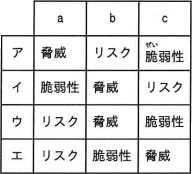 ITパスポート 平成28年度秋期午前問96 << 前の問題 | 次の問題 >>午前問96情報セキュリティにおけるリスクマネジメントに関して、次の記述中のa〜cに入れる字句の適切な組合せはどれか。情報セキュリティにおいて、組織がもつ情報資産のaを突くbによって、組織が損害を被る可能性のことをcという。アイウエ『情報処理過去問.com』からiPhoneアプリがリリースされました!!正解イ<< 前の問題 | 次の問題 >>
