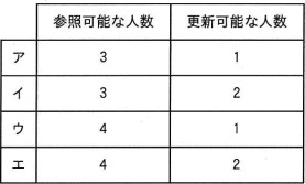 所属するグループ又はメンバに設定した属性情報によって、人事ファイルへのアクセス権を管理するシステムがある。人事部グループと、所属するメンバA〜Dの属性情報が次のように設定されているとき、人事ファイルを参照可能な人数と更新可能な人数の組合せはどれか。〔属性情報の設定方式〕属性情報は3ビットで表される。各ビットは、左から順に参照、更新、削除に対応し、1が許可、0が禁止を意味する。グループの属性情報は、メンバの属性情報が未設定の場合にだけ適用される。〔属性情報の設定内容〕人事部グループ:100メンパA:100、メンバB:111、メンバC:110、メンバD:未設定