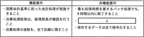 ITパスポート 平成28年度春期午前問1 次の問題 >>午前問1連結会計システムの開発に当たり、機能要件と非機能要件を次の表のように分類した。aに入る要件として、適切なものはどれか。ア故障などによる年間停止時間が、合計で10時間以内であることイ誤入力した伝票は、訂正用伝票で訂正することウ法定帳票以外に、役員会用資料作成のためのデータを自動抽出できることエ連結対象とする会社は毎年変更できること『情報処理過去問.com』からiPhoneアプリがリリースされました!!正解ア次の問題 >>