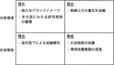 ITパスポート 平成28年度春期午前問30 << 前の問題 | 次の問題 >>午前問30自動車メーカA社では、近い将来の戦略を検討するため自社の強みと弱み、そして、外部環境の機会と脅威を整理した。この結果を基に、強みを活用して脅威を克服する対策案として、適切なものはどれか。ア熟練工の定年を延長、又は再雇用を実施する。イ低金利で資金を調達し、石油を大量に備蓄する。ウ電気自動車の研究開発を推し進め、商品化する。エブランドイメージを生かして販売力を強化する。『情報処理過去問.com』からiPhoneアプリがリリースされました!!正解ウ<< 前の問題 | 次の問題 >>