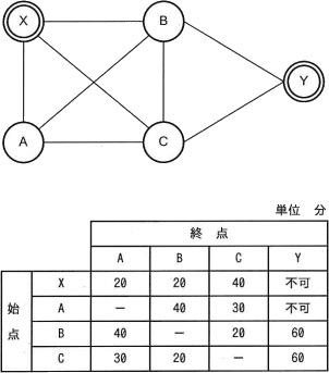 ITパスポート 平成28年度春期午前問33 << 前の問題 | 次の問題 >>午前問33地点Xから出発してA、B、Cの3地点の全てを経由して地点Yまで行きたい。各地点間の経路と所要時間が図及び表のとおりであるとき、地点Xから地点Yまで行く最短の時間は何分か。ここで、3地点A、B、Cはどのような順番で経由してもよいものとする。ア110イ130ウ140エ150『情報処理過去問.com』からiPhoneアプリがリリースされました!!正解イ<< 前の問題 | 次の問題 >>