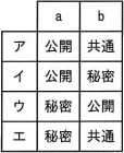 ITパスポート 平成28年度春期午前問87 << 前の問題 | 次の問題 >>午前問87公開鍵暗号方式を用いた機密データの受渡しに関する記述中のa、bに入れる字句の適切な組合せはどれか。 データの受信者Aは、自分のa鍵とb鍵を用意してa鍵を送信者Bに送付する。データの送信者Bは、受信者Aから送付されたa鍵を用いてデータを暗号化して受信者Aに送信する。受信者Aは、送信者Bから受信した暗号化されたデータを自分のb鍵を使って復号する。アイウエ『情報処理過去問.com』からiPhoneアプリがリリースされました!!正解イ<< 前の問題 | 次の問題 >>