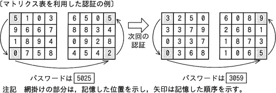 設問の認証方式は、マトリクス認証と呼ばれ、アクセスごとに異なる数字が表示されるマトリクス表から予め設定した位置と順番で、認証を行うワンタイムパスワードです。マトリクス表はアクセスごとに異なるのでパスワードが漏洩しても不正利用されることがありません。