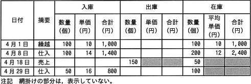 ITパスポート 平成29年度春期午前問32 << 前の問題 | 次の問題 >>午前問32ある商品の4月の仕入と売上が表のとおりであるとき、移動平均法による4月末の商品の棚卸評価額は何円か。移動平均法とは、仕入の都度、在庫商品の平均単価を算出し、棚卸評価額の計算には直前の在庫商品の平均単価を用いる方法である。ア1,280イ1,300ウ1,400エ1,500『情報処理過去問.com』からiPhoneアプリがリリースされました!!正解ウ<< 前の問題 | 次の問題 >>