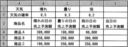 表計算ソフトを用いて、天気に応じた売行きを予測する。表は、予測する日の天気(晴れ、曇り、雨)の確率、商品ごとの天気別の売上予測額を記入したワークシートである。セル E4 に商品Aの当日の売上予測額を計算する式を入力し、それをセル E5〜E6 に複写して使う。このとき、セル E4 に入力する適切な式はどれか。ここで、各商品の当日の売上予測額は、天気の確率と天気別の売上予測額の積を求めた後、合算した値とする。