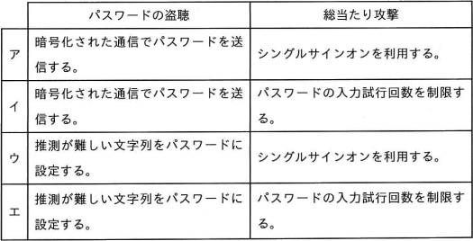 ITパスポート 平成31年度春期午前問59 << 前の問題 | 次の問題 >>午前問59ログイン機能をもつWebサイトに対する、パスワードの盗聴と総当たり攻撃へのそれぞれの対策の組合せとして、最も適切なものはどれか。アイウエ『情報処理過去問.com』からiPhoneアプリがリリースされました!!正解イ<< 前の問題 | 次の問題 >>