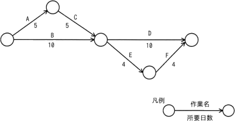 図のアローダイアグラムにおいて,作業Bが2日遅れて完了した。そこで,予定どおりの期間で全ての作業を完了させるために,作業Dに要員を追加することにした。作業Dに当初20名が割り当てられているとき,作業Dに追加する要員は最少で何名必要か。ここで,要員の作業効率は一律である。
