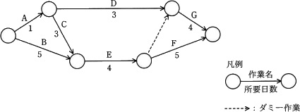あるプロジェクトの日程計画をアローダイアグラムで示す。クリティカルパスはどれか。
